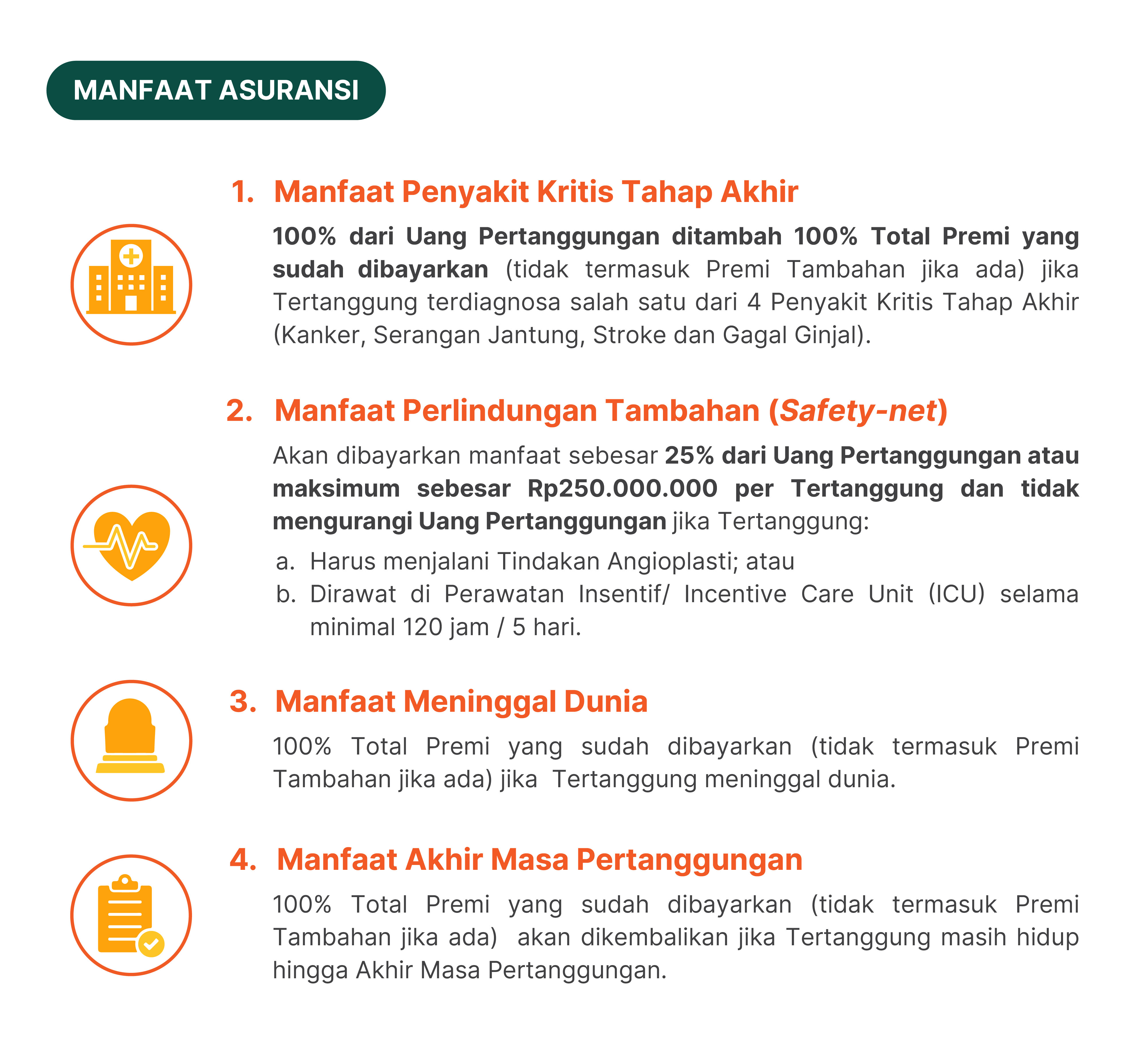 Proteksi Prima Kritis Andalan sebagai produk asuransi Kesehatan yang memberikan manfaat pertanggungan terhadap 4 penyakit kritis utama tahap akhir (Kanker, Serangan Jantung, Stroke atau Gagal Ginjal) dengan pengembalian premi 100%.