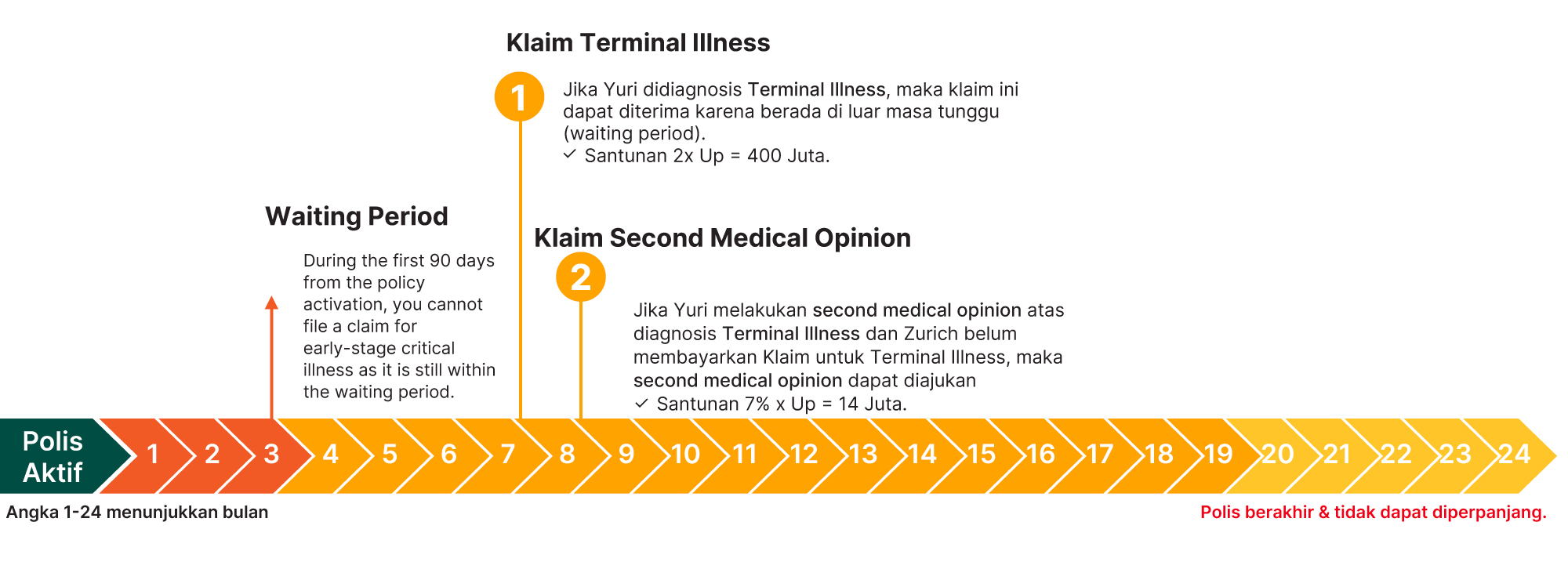 1. Jika Anda sudah melakukan klaim dan menerima manfaat Penyakit Kritis Tahap Awal, maka manfaat Penyakit Terminal yang akan dibayarkan oleh Zurich adalah 1 (satu) kali dari Uang pertanggungan.