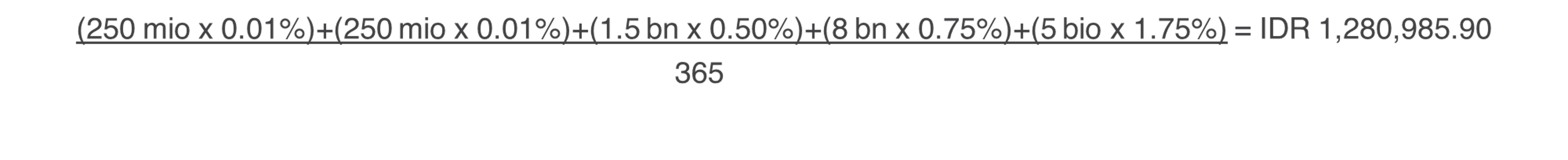 A simulation of how interest is calculated for a Giro BISA account (one day) with a balance of IDR 30,000,000,000, based on tiered interest rates as outlined below: