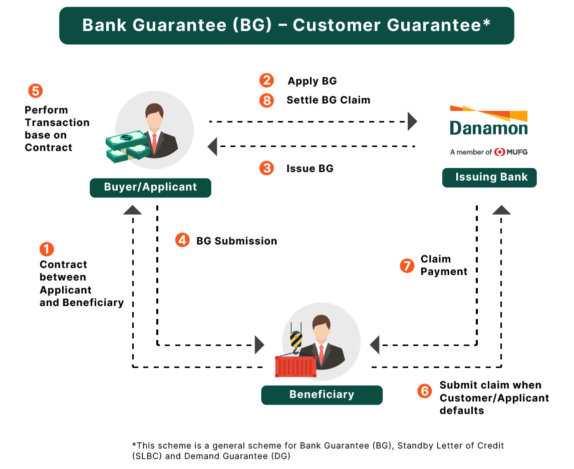 A written guarantee issued by Danamon on behalf of Applicant to the Beneficiary. If Applicant fails to complete their contractual duties, the beneficiary can make a claim on the guarantee that has been issued by Danamon on behalf of the Applicant.