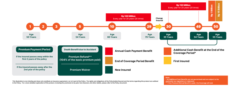 - Annual cash payment benefits start from the 10th year until the end of coverage period