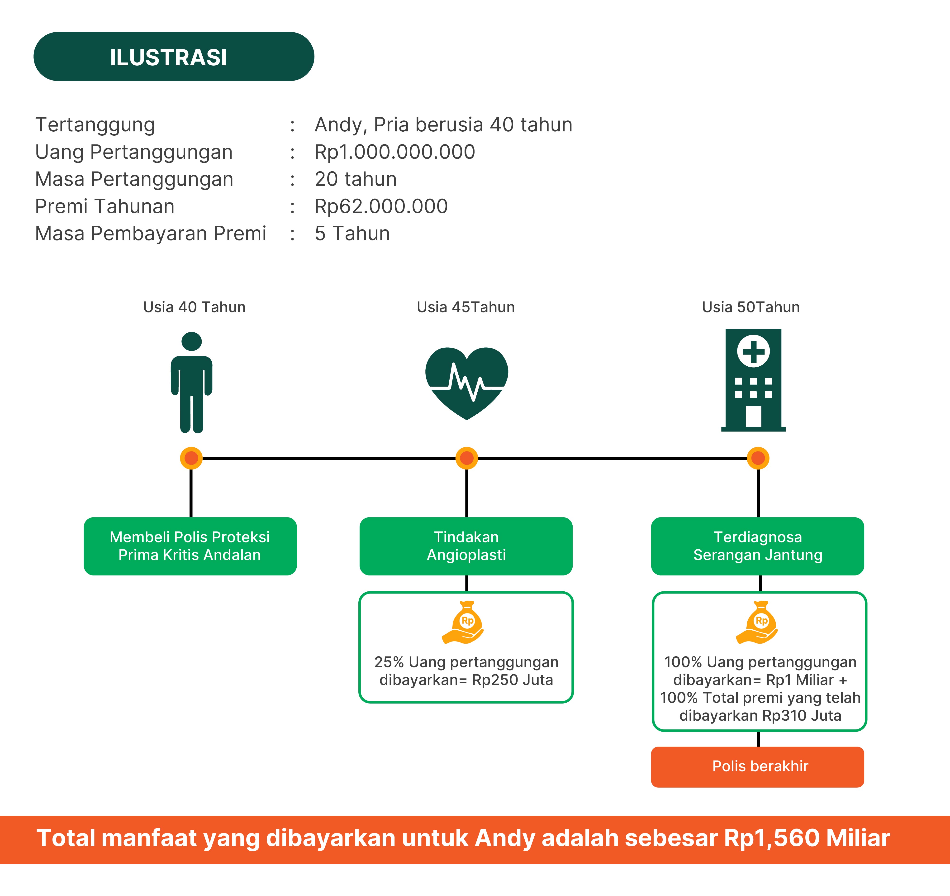 Proteksi Prima Kritis Andalan sebagai produk asuransi Kesehatan yang memberikan manfaat pertanggungan terhadap 4 penyakit kritis utama tahap akhir (Kanker, Serangan Jantung, Stroke atau Gagal Ginjal) dengan pengembalian premi 100%.