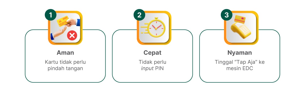 - Transaksi dengan fitur Contactless yang dilakukan di luar Indonesia akan mengikuti ketentuan regulasi yang berlaku pada masing-masing negara.