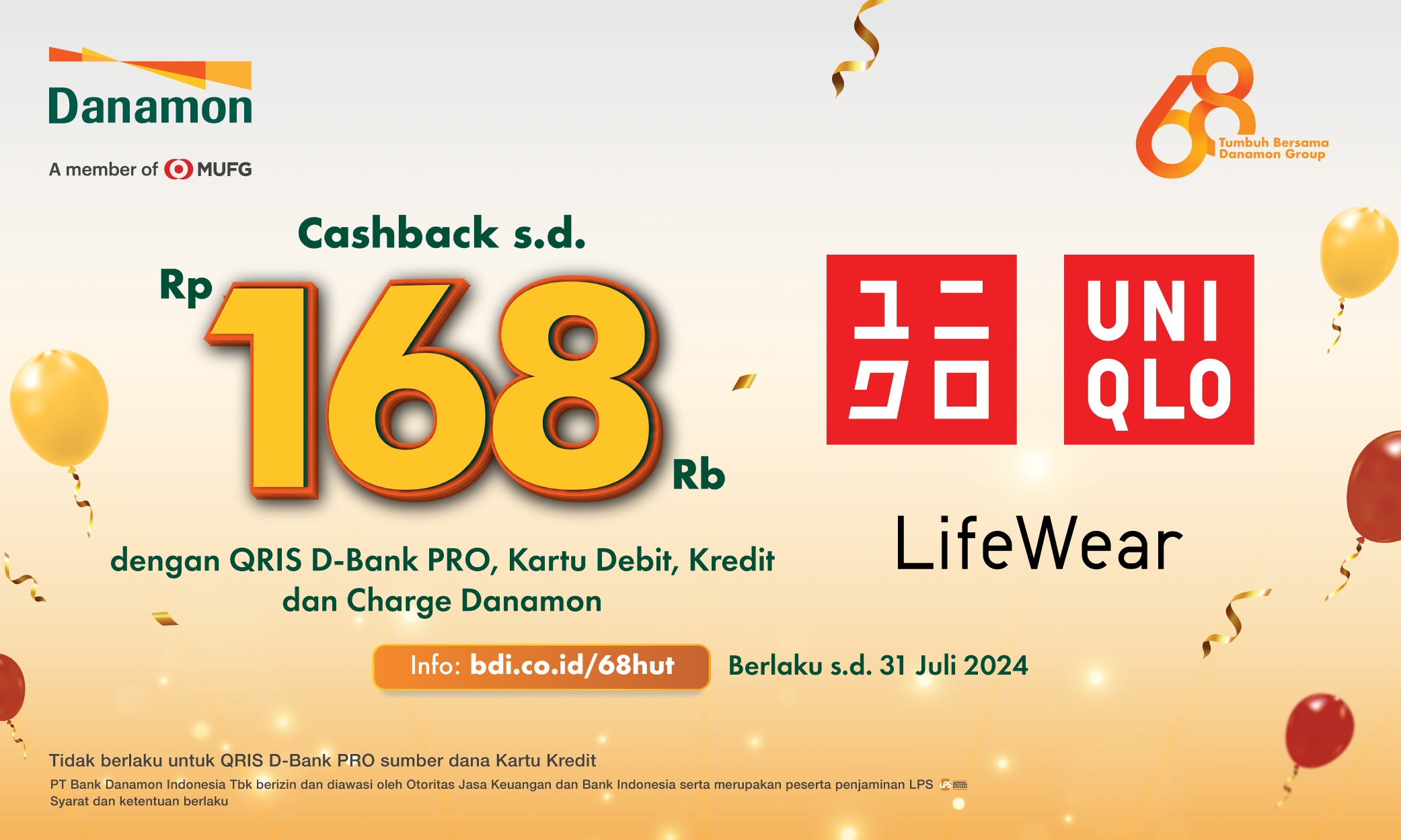 Selama bulan Juli, Danamon menghadirkan promo unggulan berupa cashback untuk pembelanjaan di Toko UNIQLO & UNIQLO.com hingga Rp168.000,-. Promo ini dapat digunakan selama tanggal 1-31 Juli 2024, dengan transaksi menggunakan QRIS D-Bank PRO, Kartu Debit, Kredit, dan Charge Danamon.