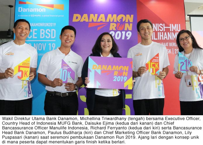 Jakarta, 15 Agustus 2019. PT Bank Danamon Indonesia Tbk (“Bank Danamon” atau “Bank”) akan menggelar kembali ajang lari Danamon Run, lomba lari dengan konsep unik dan pertama di Indonesia dimana pelari dapat menentukan garis finish ketika sedang berlari. Di tahun ketiganya, Danamon Run 2019 dijadwalkan terlaksana pada 10 November 2019 di area ICE BSD, Tangerang Selatan. Dengan target 6.000 peserta, ajang lari ini menghadirkan empat jarak lari yang terdiri dari 5 Km, 10 Km, 15 Km dan 21 Km atau Half Marathon.