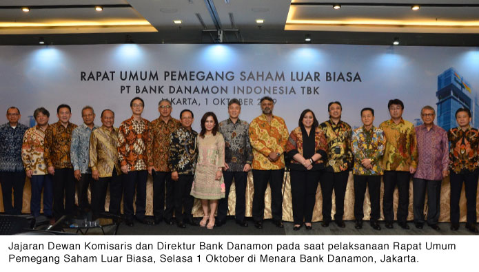 Jakarta, 1 Oktober 2019. PT Bank Danamon Indonesia Tbk (”Perseroan”) menyelenggarakan Rapat Umum Pemegang Saham Luar Biasa (RUPS-LB) hari ini. RUPS-LB menyetujui perubahan susunan Dewan Komisaris, Direksi, dan perubahan pada Anggaran Dasar Perseroan.