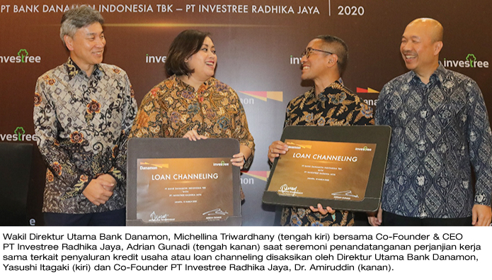 12 Maret 2020 – PT Bank Danamon Indonesia Tbk (“Bank Danamon”) dan PT Investree Radhika Jaya (“Investree”), penyedia jasa business-to-business (B2B) marketplace lending terkemuka di Indonesia, menandatangani perjanjian kerja sama terkait penyaluran kredit usaha atau loan channeling, di mana Bank Danamon menyalurkan pinjaman melalui platform online Investree. Melalui skema loan channeling ini, nasabah akan menerima kemudahan dan akses cepat dari layanan pinjaman online dengan plafon pinjaman yang lebih tinggi layaknya kredit perbankan. Perjanjian kerja sama ini ditandatangani hari ini di Jakarta.