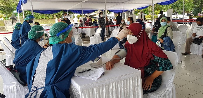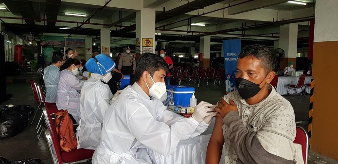 Proses pemberian vaksin dosis pertama di Pasar Senen, Jakarta, bekerja sama dengan Perumda Pasar Jaya, Dinas Kesehatan DKI Jakarta, dan RS Premiere Jatinegara Jakarta.