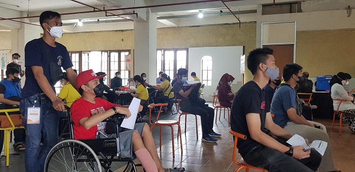 Para peserta dari masyarakat umum dan komunitas pasar sedang menunggu giliran vaksinasi di Pasar Baltos, Bandung. Program ini terselenggara sebagai hasil kerja sama Bank Danamon dengan Perumda Pasar Juara dan Dinas Kesehatan Kota Bandung.