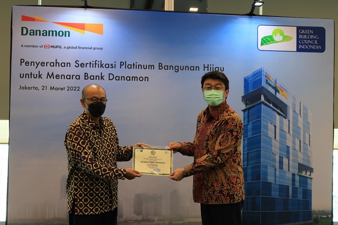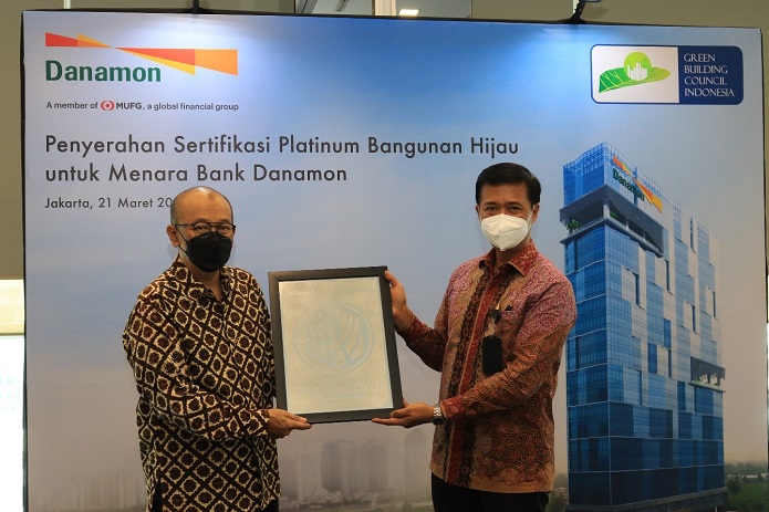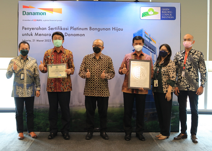 Jakarta, 21 Maret 2022 - PT Bank Danamon Indonesia Tbk (Danamon) menerima sertifikasi Greenship Certification, Platinum hari ini dalam upayanya mendukung program pengembangan yang berkelanjutan demi masa depan generasi penerus. Acara penyerahan plakat dan sertifikat ini diselenggarakan di Menara Bank Danamon dan dihadiri secara langsung oleh Herry Hykmanto selaku Direktur Syariah Danamon, Iwan Prijanto selaku Ketua Green Building Council Indonesia, konsultan PT Narama Mandiri dan PT Colliers International, bersama perwakilan tim Corporate Real Estate Management dan Sustainability Finance Danamon.