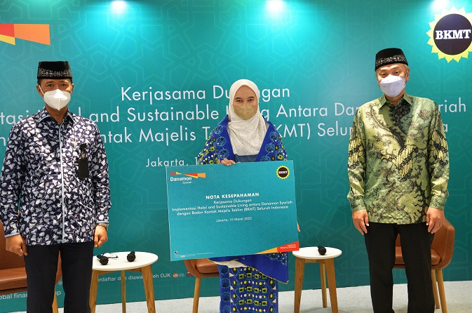 Jakarta, 11 Maret 2022 - PT Bank Danamon Indonesia Tbk (Danamon) melalui unit usaha Danamon Syariah hari ini menjalin kerja sama dengan Badan Kontak Majelis Taklim (BKMT) Pusat dalam mendukung implementasi Halal & Sustainable Living. Acara peresmian kerja sama ini diselenggarakan secara hybrid luring dan daring di Gedung Menara Bank Danamon, dan dihadiri secara langsung oleh Direktur Utama Bank Danamon, Yasushi Itagaki, Herry Hykmanto selaku Direktur Syariah & Sustainability Finance Bank Danamon, dan Syifa Fauzia selaku Ketua Umum Badan Kontak Majelis Taklim (BKMT) Pusat.