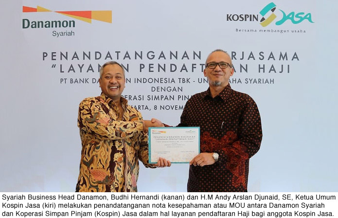 Jakarta, 8 November 2019. PT Bank Danamon Indonesia Tbk (Bank Danamon) melalui Unit Usaha Syariah (Danamon Syariah) dan Koperasi Simpan Pinjam (Kospin) Jasa hari ini melakukan penandatanganan nota kesepahaman (memorandum of understanding atau MOU) dalam hal layanan pendaftaran Haji bagi anggota koperasi. Kerja sama Bank Danamon dan Kospin Jasa menjadi satu inisiatif penting bagi kedua belah pihak di mana Kospin Jasa akan membukakan peluang akses pada anggota koperasi di seluruh Indonesia. Di sisi lain, Bank Danamon menjadi salah satu mitra penyedia solusi keuangan Syariah yang terintegrasi untuk membantu para anggota Kospin Jasa.
