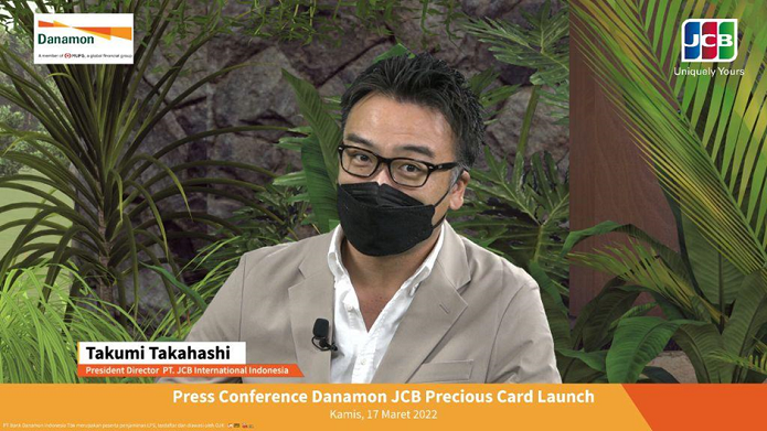 “Saya senang dapat mempersembahkan Kartu Kredit Danamon JCB Precious bersama dengan Danamon, yang merupakan salah satu bank terbesar di Indonesia. Nasabah dapat menikmati penggunaan kartu mereka setiap hari di Indonesia dan juga di seluruh dunia dengan menggunakan jaringan merchant JCB. Kartu kredit Danamon JCB Precious tidak hanya berguna sebagai getaway companion untuk bepergian, tetapi juga untuk bersantap, gaya hidup, atau bebas dari rutinitas,” ujar Presiden Direktur PT JCB International Indonesia, Takumi Takahashi.