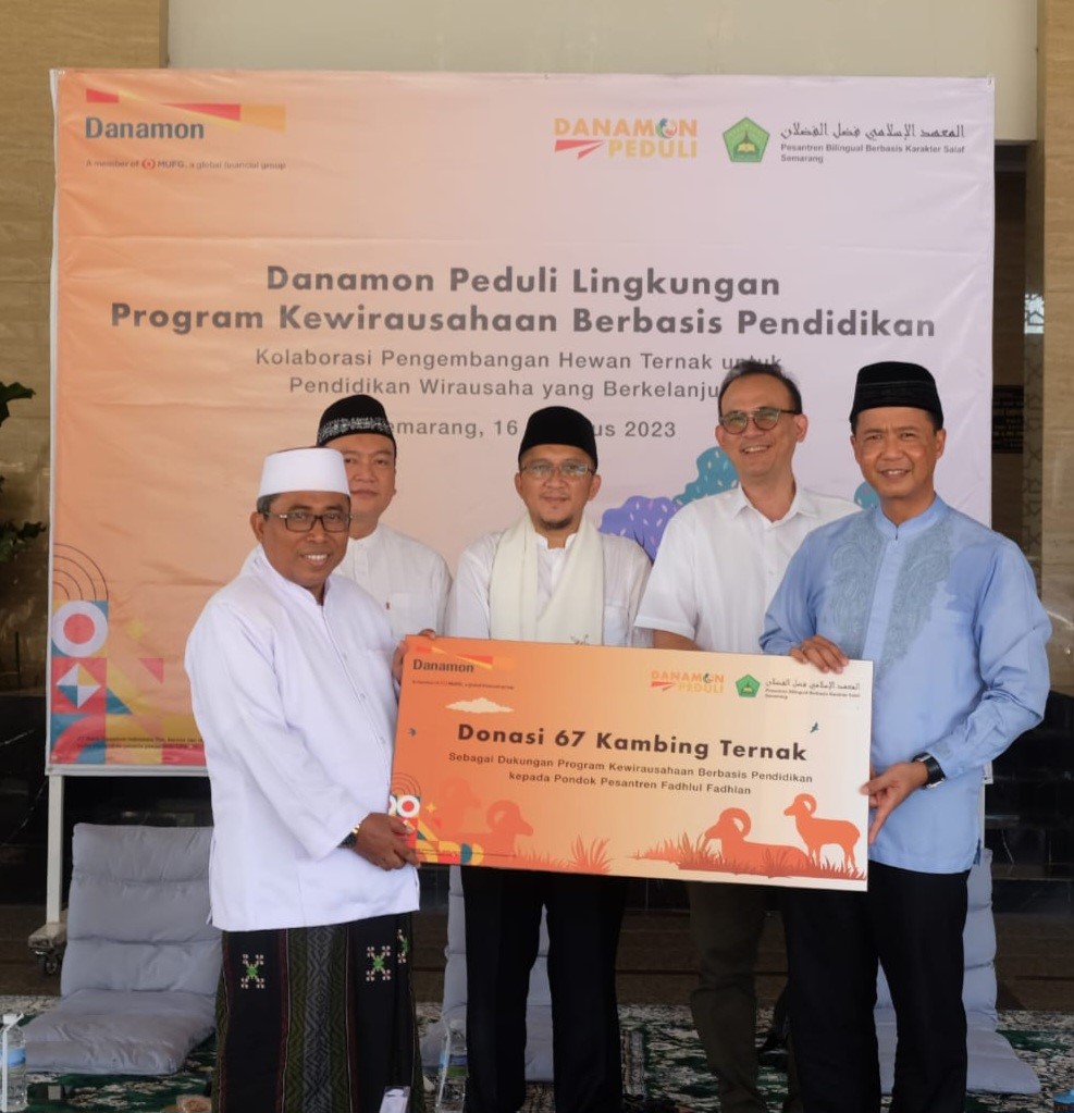 Semarang, 16 Agustus 2023 - PT Bank Danamon Indonesia Tbk (Danamon) melalui program Danamon Peduli, sebagai bentuk kegiatan CSR Perusahaan, selain secara aktif mengampanyekan inisiatif penurunan kadar emisi karbon, juga memberikan perhatian khusus terhadap isu pendidikan. Dalam rangkaian kegiatan Peduli Lingkungan 2023, Danamon Regional Jawa Tengah mendonasikan 67 kambing ternak sebagai dukungan Program Kewirausahaan Berbasis Pendidikan yang dirintis Pondok Pesantren Fadhlul Fadhlan Semarang.