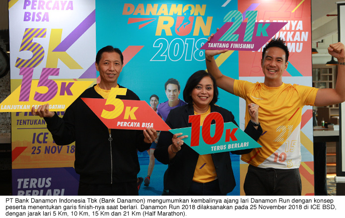 Jakarta, 12 September 2018. PT Bank Danamon Indonesia Tbk (“Bank Danamon”) hari ini mengumumkan kembalinya ajang lari Danamon Run, lomba lari dengan konsep unik dimana peserta bisa menentukan garis finish-nya saat berlari. Kegiatan lari berkonsep unik yang pertama kali ada di Indonesia ini akan dilaksanakan pada 25 November 2018 di area ICE BSD, Tangerang Selatan. Danamon Run menawarkan jarak lari 5 KM, 10 KM, 15 KM dan 21 KM (Half Marathon), yang sekaligus dilaksanakan dalam memperingati Hari Kesehatan Nasional pada tanggal 12 November 2018 mendatang.