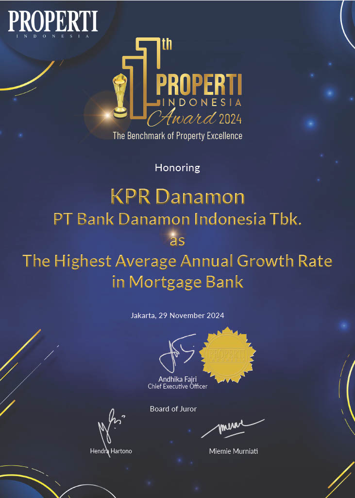 Danamon Menerima Penghargaan pada Ajang 11th Properti Indonesia Award 2024 Sebagai The Highest Average Annual Growth Rate in Mortgage Bank