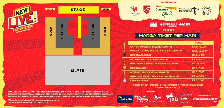 Informasi acara mengenai pertunjukan Danamon Optimal New Live! Experience: Tajuk Konser Danamon Optimal New Live! Experience didukung oleh Kemenparekraf Didukung oleh Bank Danamon, Langit Musik, UPOINT.ID, NSP 1212, Autocillin, Tiketapasaja.com, Jakarta Experience Board, Teh Botol Sosro, Garuda Indonesia dan Tiketapasaja by Melon Tanggal Konser Sabtu, 29 Agustus 2020 & Minggu, 30 Agustus 2020 Tempat Acara Parkir Barat – JIExpo Kemayoran Jakarta Pengisi Acara KAHITNA dan Project A (Afgan dan Armand Maulana) Dipromotori oleh Berlian Entertainment, Mata Elang Productions, Mahaka Radio Integra Tiket & informasi tiketapasaja.com by Melon Situs resmi www.newliveexperience.com Laman Instagram @newliveexperience @berlianentertainment Tagar resmi acara #NewLiveExperience #SafetyAndSpectacular #BerlianEntertainment #MakeItBrilliant #MataElangProductions #MahakaRadioIntegra F & B Makanan dan Minuman yang dapat dipesan sebelumnya (pre-order) Harga tiket* Penjualan tiket akan dibagi menjadi 2 fase penjualan Tiket dijual per-hari melalui www.tiketapasaja.com. Terlampir denah layout dan kategori kelas: Platinum, Gold dan Silver