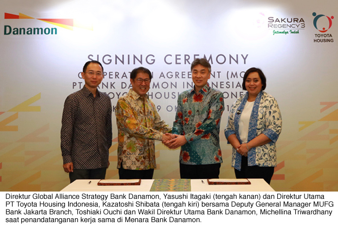 Jakarta, 30 Oktober 2018. PT Bank Danamon Indonesia Tbk (Bank Danamon) hari ini meresmikan kerja sama penyaluran Kredit Pemilikan Rumah (KPR) dengan PT Toyota Housing Indonesia, perusahaan properti milik Toyota Housing Corporation Ltd, salah satu pengembang terkemuka asal Jepang. Terjalinnya kemitraan strategis ini semakin memberikan kontribusi positif dalam usaha membantu setiap keluarga di Indonesia memiliki rumah yang berkualitas dan relatif terjangkau.