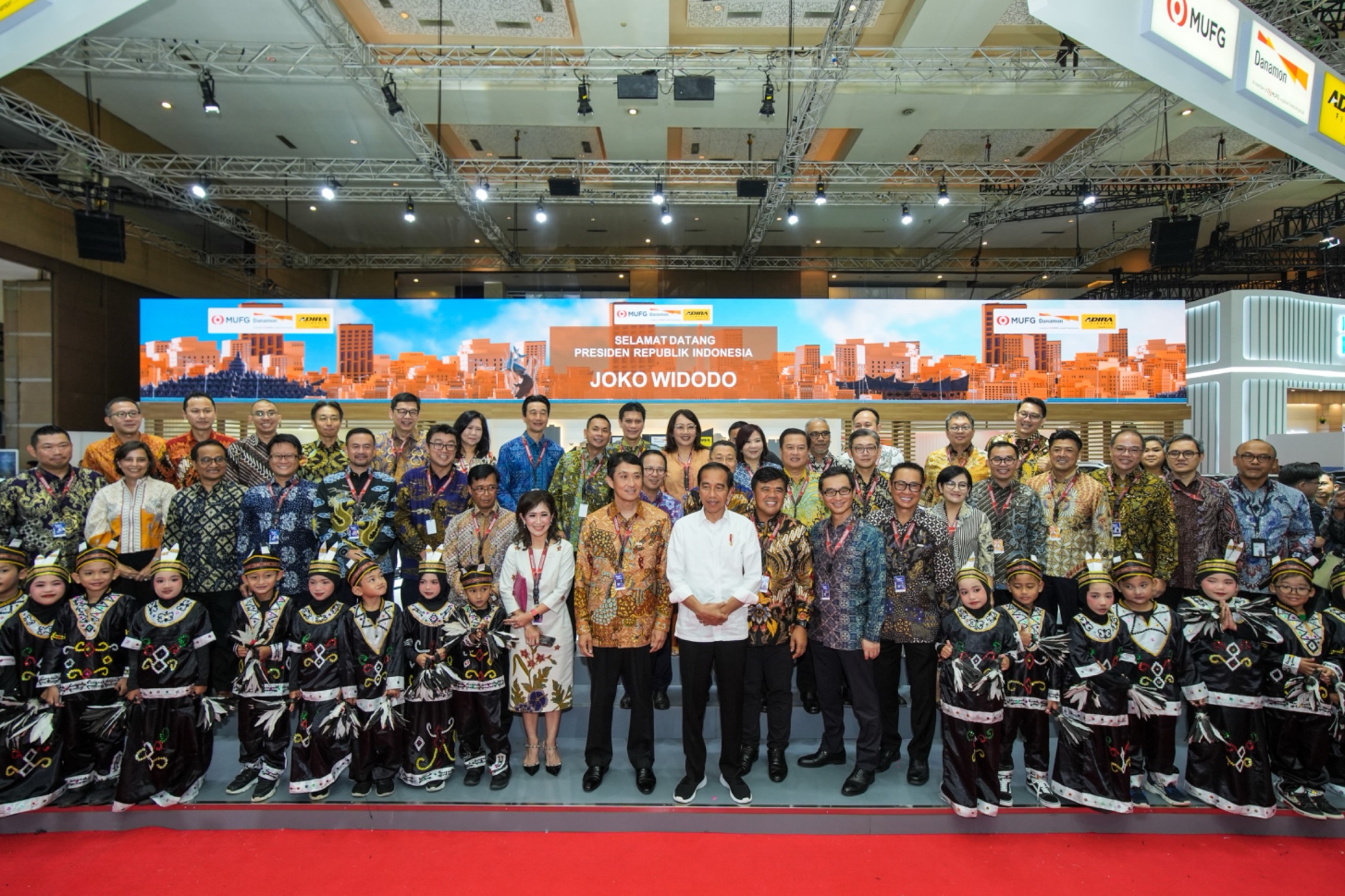 Presiden Republik Indonesia, Joko Widodo (tengah), berfoto bersama Daisuke Ejima, Direktur Utama PT Bank Danamon Indonesia Tbk (barisan terdepan, kesembilan dari kiri); Dewa Made Susila, Direktur Utama PT Adira Dinamika Multi Finance, Tbk. (barisan terdepan, kesembilan dari kanan); serta Kazushige Nakajima, Executive Officer, Country Head of Indonesia, MUFG Bank Ltd. (barisan terdepan, kedelapan dari kanan); beserta jajaran manajemen MUFG, Danamon, dan Adira Finance berfoto bersama di booth MUFG, Danamon, dan Adira Finance setelah Opening Ceremony Indonesia International Motor Show (IIMS) 2024 di JIExpo Kemayoran, Hall D, Jakarta Pusat, Kamis (15/02/2024).