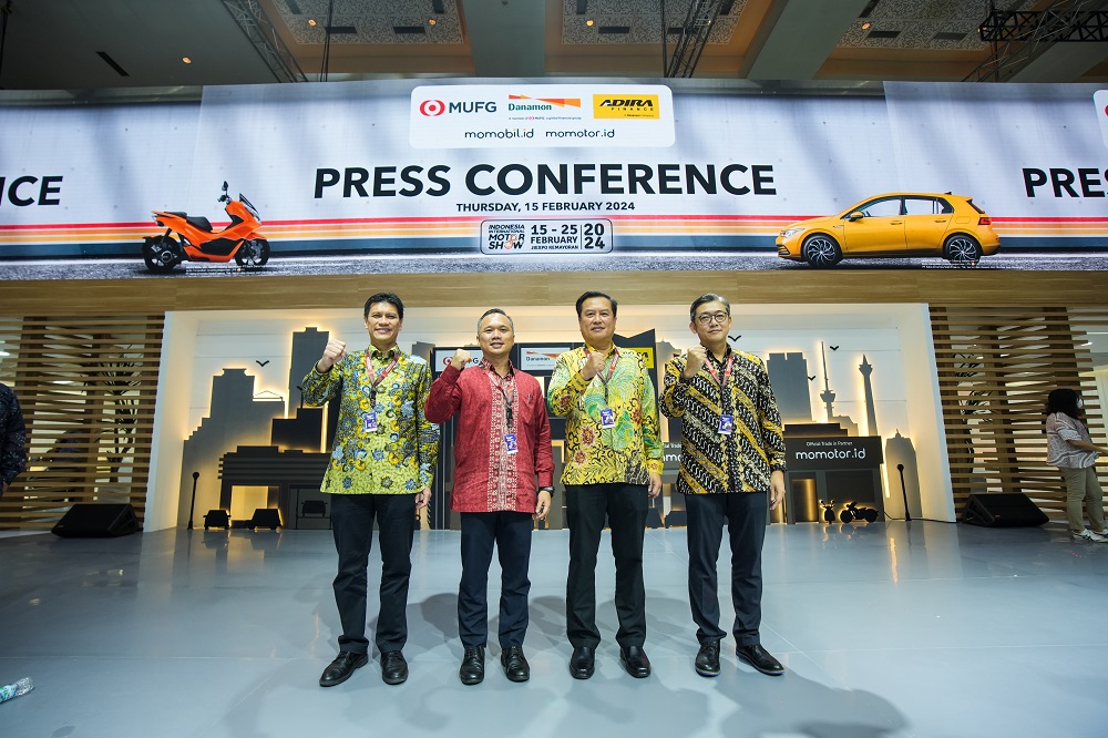 (Kiri ke kanan) Andrew Suhandinata, Transaction Banking Head PT Bank Danamon Indonesia Tbk; Ivan Jaya, Consumer Funding & Wealth Business Head PT Bank Danamon Indonesia Tbk; Harry Latif, Chief of Portfolio Officer PT Adira Dinamika Multi Finance, Tbk.; dan Niko Kurniawan, Chief of Sales, Service & Distribution Officer PT Adira Dinamika Multi Finance, Tbk. berfoto bersama di booth MUFG, Danamon, dan Adira Finance seusai Press Conference Opening Day Indonesia International Motor Show (IIMS) 2024 di JIExpo Kemayoran, Hall D, Jakarta Pusat, Kamis (15/02/2024).