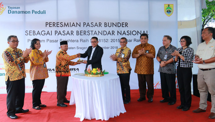 Sragen, 14 November 2018. Yayasan Danamon Peduli (“Danamon Peduli”) bermitra dengan Pemerintah Kabupaten Sragen dan Badan Standardisasi Nasional Indonesia (BSN) hari ini meresmikan Pasar Bunder sebagai pasar berstandar nasional Indonesia (ber-SNI) pertama di Kabupaten Sragen Jawa Tengah. Sertifikasi ini diraih melalui program kemitraan bertajuk Pasar Sejahtera (sehat, hijau, bersih dan terawat) yang dijalankan Danamon Peduli sejak 2010. Adanya tiga persyaratan utama yaitu persyaratan umum, teknis dan pengelolaan, serta puluhan indikator lain yang wajib dimiliki sebuah pasar rakyat, menjadikan tantangan tersendiri bagi pengelola pasar untuk dapat bertransformasi menjadi pasar berstandar nasional.