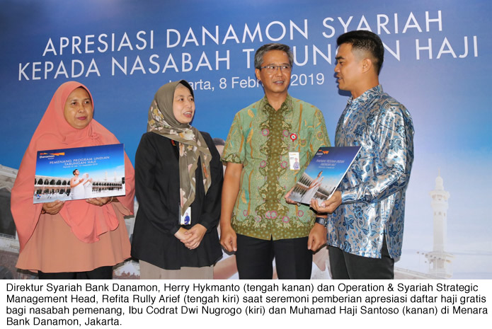 Khususnya pada kesempatan yang sama, Bank Danamon mengumumkan sekaligus menyampaikan secara resmi apresiasi kepada nasabah Danamon Syariah yang telah ikut dalam program Tabungan Haji, baik untuk daftar haji melalui Rekening Tabungan Jemaah Haji (RTJH) maupun untuk merencanakan Haji melalui Tabungan Rencana Haji (TRH). Hal ini disampaikan atas kepercayaan yang diberikan nasabah sekaligus semangat dalam melakukan perencanaan keuangan sejak dini yang patut diteladani masyarakat luas. Informasi tentang nasabah yang menerima apresiasi daftar haji gratis tersebut adalah sebagai berikut: