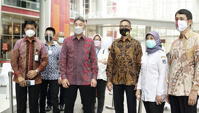 Executive Officer & MUFG Country Head Jakarta Branch, Daisuke Ejima (kiri), Direktur Utama Danamon, Yasushi Itagaki (kedua dari kiri), dan Direktur Utama Adira Finance Hafid Hadeli (kedua dari kanan) beserta Kepala Bidang Pencegahan dan Pengendalian Penyakit Dinas Kesehatan Provinsi DKI Jakarta, dr. Dwi Oktavia, TLH, M.Epid (kanan) dalam acara Sentra Vaksinasi Covid-19 Kolaborasi MUFG, Danamon dan Adira Finance yang dilaksanakan untuk mendukung percepatan program vaksinasi pemerintah. Acara ini bekerja sama dengan Kementerian Kesehatan Republik Indonesia, Pemerintah Provinsi DKI Jakarta melalu Dinas Kesehatan, Dinas Tenaga Kerja, Transmigrasi dan Energi, Dinas Perhubungan Provinsi DKI Jakarta, Rumah Sakit Mayapada, dan Halodoc sebagai fasilitator operasional dan manajemen pembuatan janji vaksinasi.