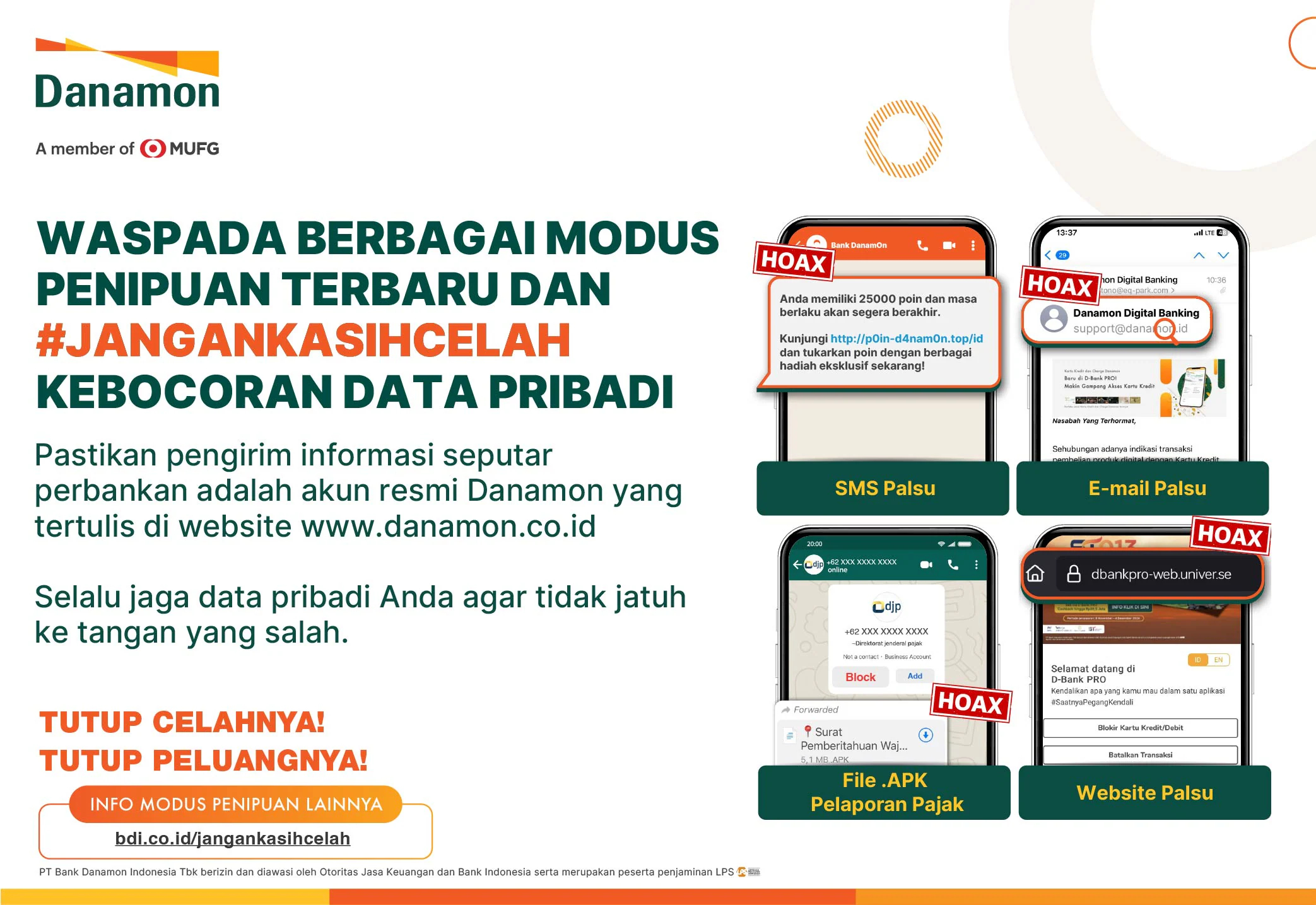“Melalui #JanganKasihCelah, Danamon terus berupaya meningkatkan kesadaran dan kewaspadaan terhadap berbagai modus penipuan online. #JanganKasihCelah menekankan pentingnya validasi sebelum berinteraksi dengan pesan atau informasi yang diterima melalui berbagai platform digital. Kami mengimbau masyarakat untuk selalu berhati-hati terhadap tawaran hadiah yang terlalu menggiurkan dengan syarat yang mudah, terutama jika tidak disertai informasi syarat dan ketentuan yang jelas,” tambah Dadi.