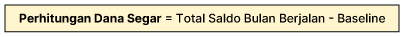 14. 14. Khusus Nasabah yang telah terdaftar pada Bank Danamon (existing to bank), dana yang diikutsertakan dalam program wajib merupakan dana segar (fresh fund). Dana yang ditempatkan dianggap dana segar (fresh fund) apabila terdapat penambahan dana terhadap baseline. Dana segar (fresh fund) harus sama dengan atau lebih dari nominal penyetoran dan penempatan dana di rekening untuk keikutsertaan Program ini. Perhitungan dana segar adalah sebagai berikut: