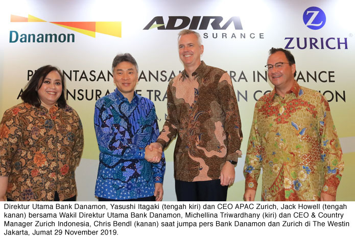 Mengenai transaksi dan kemitraan Bancassurance ini, Direktur Utama Bank Danamon Yasushi Itagaki mengatakan, “Asuransi Adira merupakan bagian yang penting dari Danamon Group. Penting bagi kami untuk memberikan apresiasi terhadap manajemen Asuransi Adira yang lalu maupun saat ini karena telah membawa perusahaan menjadi salah satu penyedia layanan asuransi umum terbesar di Indonesia. Kami yakin investasi dari Zurich, yang merupakan salah satu penyedia asuransi umum terkemuka di dunia, akan lebih memperkuat Asuransi Adira dan menambahkan nilai tambah kepada para pemegang polis serta para pemangku kepentingan lainnya.”