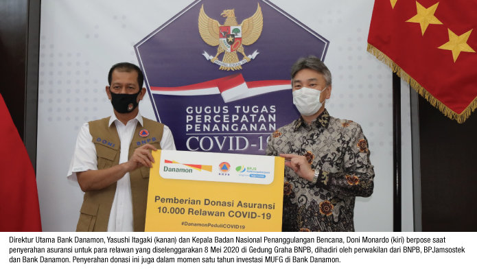 8 Mei 2020 – PT Bank Danamon Indonesia Tbk (Bank Danamon) memberikan donasi perlindungan asuransi bagi 10.000 relawan Badan Nasional Penanggulangan Bencana (BNPB). Bank Danamon memberikan donasi dalam bentuk premi asuransi jiwa dan jaminan kecelakan kerja yang dikelola oleh BP Jamsostek kepada 10.000 relawan dibawah kordinasi BNPB. Perlindungan ini diharapkan dapat memberikan dukungan dan ketenangan pikiran kepada para relawan yang merupakan pejuang garda terdepan dalam memutus rantai penyebaran COVID-19. Penyerahan donasi ini juga dalam momen satu tahun investasi MUFG di Bank Danamon.